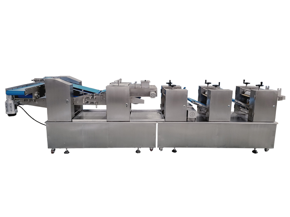 3、設(shè)備為變頻控制,每一道壓輥都采用單機(jī)驅(qū)動(dòng),通過測(cè)距傳感器,實(shí)現(xiàn)自動(dòng)面帶張緊控制,多輥聯(lián)動(dòng)??焖佥p松地制作大量面皮,提高生產(chǎn)效率。