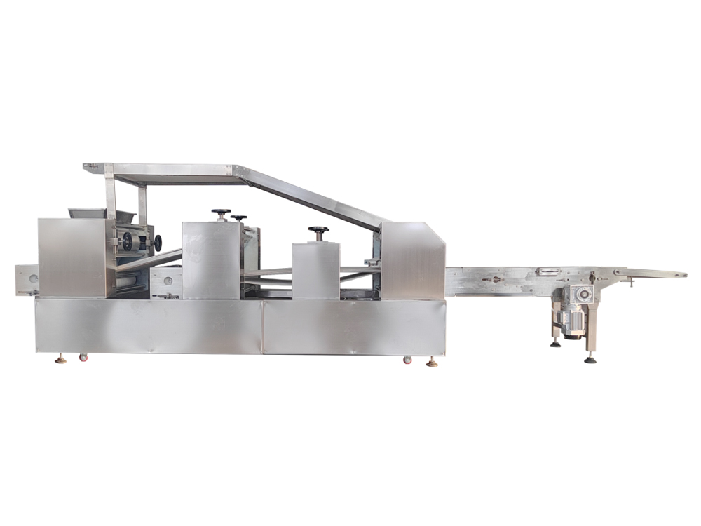 法餅成型機為臥式成型機,通過傳送機構將各道軋輥線速度比合理分配,實現從投料到制皮成型自動化生產。